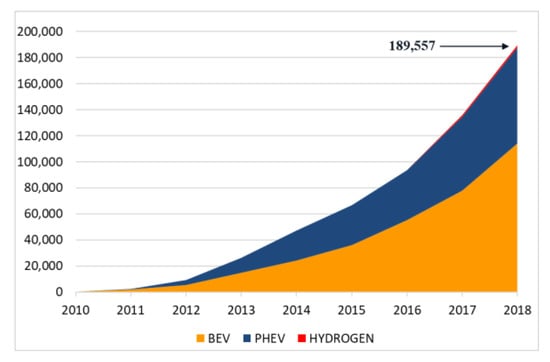 Registration data from the DMV show that at the end of 2018, the Bay Area had almost 190,000 EVs, representing 3% of the region’s vehicle fleet of roughly 5.3 million cars. BEVs make up the majority of EVs registered in the Bay Area, with over 60% of the market share; PHEVs make up 39%, and FCEVs account for less than 1% (Figure 1) [].