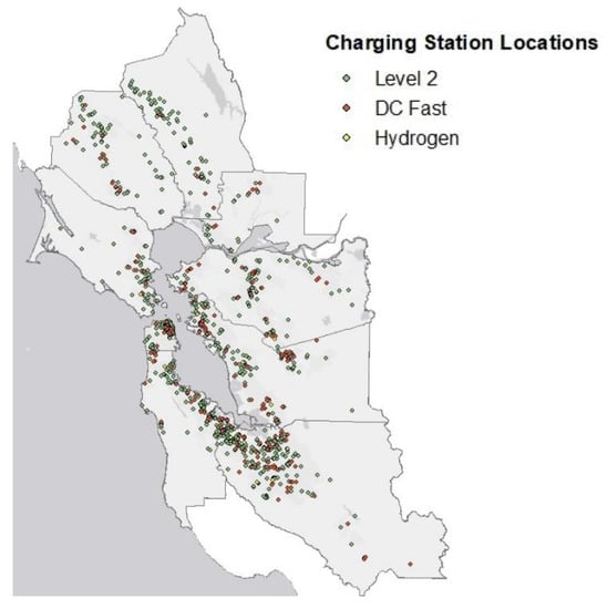 To assess the current EV charging infrastructure available in the Bay Area, staff used data from the Alternative Fuels Data Center []. These data were mapped to show the availability of public charging, or lack thereof (see Results section below). This dataset is based on self-reported information, and therefore, does not present a holistic view of all available charging. As the EV industry matures and more complete datasets become readily available, methodologies and analyses can be conducted to ensure that our plans consider nearly all charging infrastructure locations.