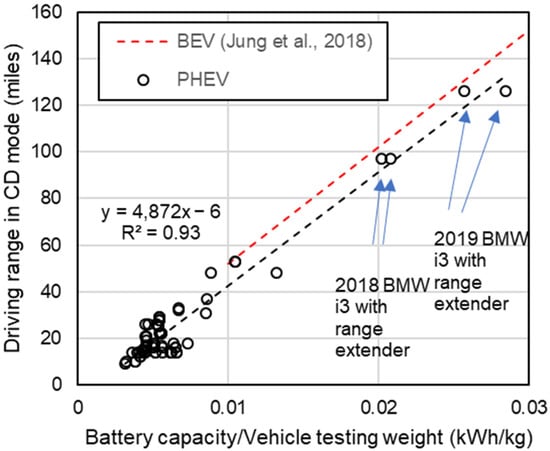 This study performed a similar analysis as Jung et al. [4] comparing the driving range of PHEVs in CD mode with vehicle weight normalized battery capacity to understand how the driving ranges of PHEVs compare with those of BEVs at similar weight normalized battery capacity. The driving ranges of PHEVs in CD mode shown in Figure 1 were obtained following EPA test procedure. EPA testing follows SAE Recommended Practice J1711, which is essentially the same single-cycle test procedure as used for electric vehicles. The driving range is determined over successive highway cycles. Figure 1 shows that the slope, 4872 (miles/(kWh/kg)), of PHEVs is very close to the slope, 5002 (miles/(kWh/kg)), of BEVs for short driving range (<150 miles) per full charge by Jung et al. [4] while the y-intercept is a little smaller for PHEVs. Note due to the heavier weight of the PHEVs per battery capacity compared to BEVs, the data for PHEVs extend further to the left in Figure 1 compared to the red dash line which represents the data for BEVs. It is also noteworthy that driving ranges of PHEVs in CD mode was ~10 miles less compared to BEVs with the same vehicle weight normalized battery capacity. The 2018 and 2019 BMW i3 had the longest driving range in CD mode with impressively large vehicle weight normalized battery capacity compared to other PHEVs.