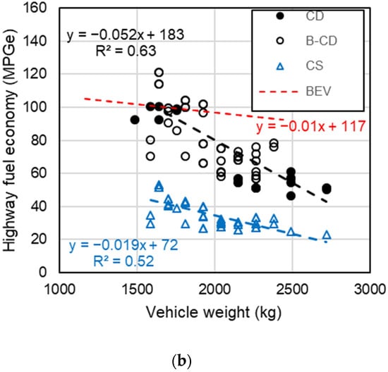 The highway fuel economy of PHEVs in CS mode depended less on vehicle weight compared to that of PHEVs in CD mode. Weight dependency of highway fuel economy for PHEVs in CS mode was similar to that of BEVs but the fuel economy in CS mode was less than 50% than that of BEVs at the same vehicle weight.