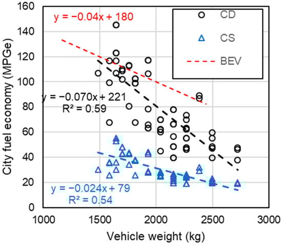 Trend of EPA city (MPGe) fuel economy with vehicle curb weight (kg). Black represents PHEV in CD mode; blue represents PHEV in CS mode and red represents BEV.