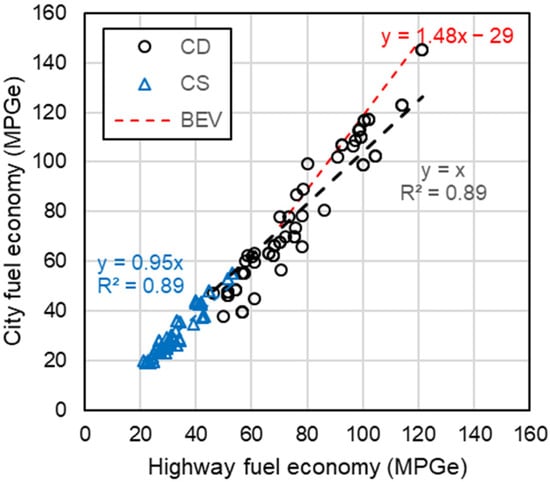 A unique relationship was found between city and highway fuel economies of PHEVs as shown in Figure 4. The slopes for city fuel economy against highway fuel economy were nearly one. It was 0.95 in CS mode and 1 in CD mode. This is somewhat different from 1.48 of non-Tesla BEVs obtained by Jung et al. [4]. The ratio for conventional vehicles is expected to be much less than 1. The ratio of near 1 suggests PHEVs operate at the same efficiency regardless of driving conditions, which is one of key features of PHEVs.