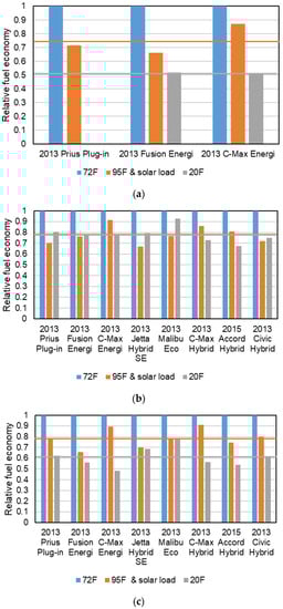Effect of ambient conditions on PHEV and HEV fuel economy. Orange and gray lines represent average values for MPGe at 95 °F with solar load (850 W/m2) and 20 °F respectively. The fuel economy was over urban driving dynamometer schedule (UDDS) cycle at (a) blended CD mode with warm start (b) CS mode with warm start (c) CS mode with cold start.