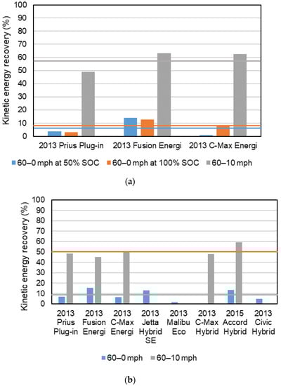 Kinetic energy recovery during regenerative braking during (a) CD mode (b) CS mode. Note 60–10 mph braking conditions were under coasting in drive condition on dry surface. Test run data were cut off when the vehicle reached 10 mph.