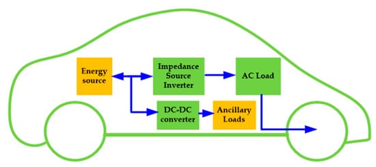 The efficient use of the available resources is one of the greatest technological concerns. With the ZSI, the improvements in DC–DC systems are going on in the field of EVs. The ZSI can regulate the voltages and currents of the energy sources and enables bidirectional flow of power in traction applications. In the propulsion mode, the voltage from the energy storage systems is provided by the ZSI, in the form of three-phase voltage, to drive the motor to produce the required torque and reach the desired speed of the vehicle. During the regenerative mode, the electric motor acts as a generator. The regenerated energy flows backward, to recharge the energy sources. The inverter operates as a rectifier, and the ZSI works as buck inverter, to recharge the energy sources. The schematic of the diagram of EV system components using an impedance source inverter is shown in Figure 9.