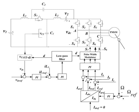 To achieve the speed control and disturbance rejection for the EV, cascade PI controllers were designed. The motor (PMSM) with PI control technique was adopted. The speed control scheme for EQZSI is shown in Figure 10.