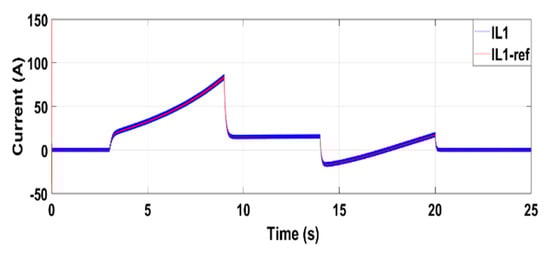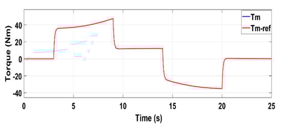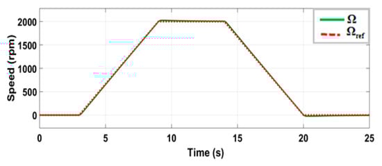 The electric vehicle motor used in the simulation is a PMSM with three phases, as defined in Section 3.2.1. The parameters of the motor are = 1 mH; = 0.08 Ω; p = 2; = 0.1 Wb. The rated power is 15 kW. Figure 11 and Figure 12 show the speed and torque waveforms, respectively. Figure 13 and Figure 14 represent the voltage and current, as well as their references, respectively.