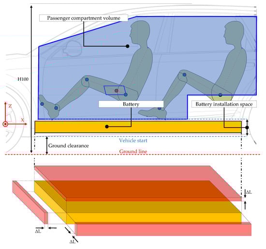 To define the aforementioned interdependency between passenger compartment and battery, we start from the vehicle external dimensions. The vehicle external dimensions are employed as input in various parametrical models for the early vehicle development design [] (p. 26), [] (p. 68), and []. The total vehicle height (H100, Figure 1) belongs to the main vehicle’s external dimensions. The driver’s required space is derived using dimensional concept measures, as will be shown in the following sections. The vehicle’s ground clearance (Figure 1) can be modeled using existing standards and norms [,,]. Subsequently, subtracting the driver required space and the ground clearance from the H100, it is possible to derive the available battery space in Z-direction (Figure 1). Let us suppose that an increase of the driver headroom ΔL is required, for example, due to higher comfort requirements. In order to maintain the required vehicle’s height, the headroom increment ΔL results in an equal loss of battery space in the Z-direction. A loss ΔL in the Z-direction causes a greater volume loss (and consequently installable battery capacity loss) than an equal loss in the X- or Y-direction (Figure 1), so we will focus mainly on the Z-direction. Furthermore, the increased headroom ΔL leads to a higher passenger compartment volume. This volume increase causes secondary effects such as higher energy consumption by the HVAC system. BEVs are particularly affected by the HVAC system because the latter can reduce range dramatically at low and high temperatures [] (p. 7). In order to achieve the same required range, the battery capacity has to be enlarged, thus increasing its volume. This creates a conflict between required battery space and required passenger compartment space. To quantify the secondary volume effects caused by the passenger compartment on the battery (and vice versa), the relevant geometrical relationships between these two components need to be identified.