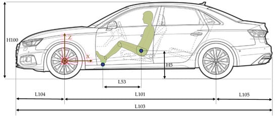 Table 1 further illustrates the values derived for the measures of the dimensional chain in the X-direction. The table lists the categorization applied to each measure, the number of samples (NoS), the resulting mean value (µ), the standard deviation (σ), and the coefficient of variation (CoV). For the derivation of L53-1-max as in Equation (4), the manikin dimensions and the angles A46 and A44 are required. The manikin dimensions are documented in the SAE standards, so they are not listed in the table. Regarding the ankle angle A46, the data analysis shows that the recommended value of 87° [] (p. 30) corresponds to the values shown by the vehicles in our database. For the knee angle A44, the data analysis shows a variation of between 120° and 135°; the database mean value is shown in Table 1.