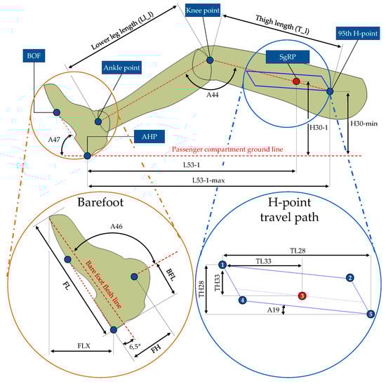 The dimensional chain in the X-direction describes the passenger compartment’s length. To implement this chain, it is necessary to identify the reference points that describe the driver’s legroom. These points are: the accelerator heel point (AHP), the ball of the foot (BOF), and the hip point (H-point) [] (p. 22). Figure 3 shows the aforementioned reference points and the main dimensions of the driver’s leg and foot. Regarding the position of the reference points, we consider the AHP and BOF to be fixed since they are defined by the accelerator pedal in its unpressed state. On the other hand, the H-point position can vary according to the seat position. The latter can be adjusted both in the X- and the Z-direction, which causes a corresponding shift of the H-point. The area that describes all the possible positions of the H-point is the H-point travel path (Figure 3). To better understand the H-point travel path, we have to discuss its correlation with the leg and foot dimensions.