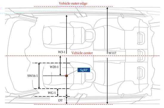 The width of the seat is defined using the SW16-1 measure, and the distance between the seat and door is defined using the WG-1 measure [] (p. 597). Adding the door thickness (DT) at the SgRP height, it is possible to derive the vehicle width W117 at the first row of seats, as in (8).