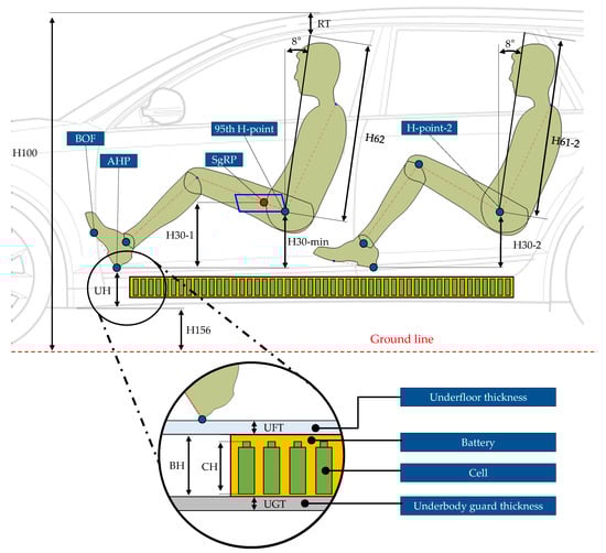 The underbody height (UH) varies according to the manufacturer and the installed cell geometry. BEVs normally have a higher UH as ICEVs due to the required space for the traction battery. Given the cell height (CH), it is possible to derive the required UH using Equation (10), in which UFT is the underfloor thickness, UGT is the underbody guard thickness, and PFZ the cell packaging factor in the Z-direction. The latter represents the ratio between the CH and the battery height (BH). The PFZ has to be derived empirically based on the evaluation of existing vehicles. One approach for the derivation of packaging factors can be found in [] (p. 65).