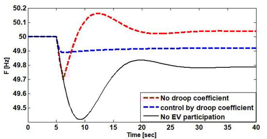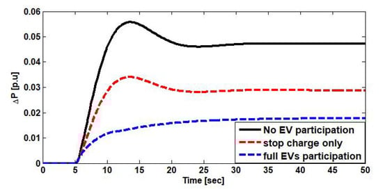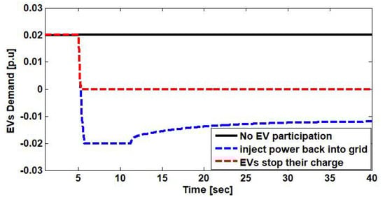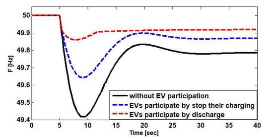 - EVs in Group 2 provide primary reserve by stopping their charge and injecting their power back into grid as followswhere , , and are the primary reserve from all EVs in group 2, the number of EVs in group 2, and the maximum EV charging power rate in [kW], respectively. It is worth mentioning that the number 2 in Equation (1) is added because the electric vehicles in this group participate to frequency control not only by stopping their charging power, but also by injecting some of the stored electric energy in their batteries into the electric power grid.