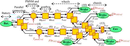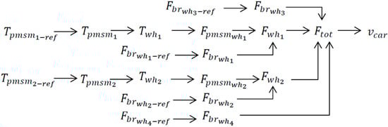 The EMR formalism is used to define the tuning path (Figure 4) to control the car operation. The controlled variable is the car velocity . Following the causality principle, the force applied to each wheel should be controlled during traction and braking to control . The traction mode is controlled using only the rear wheels, while the braking mode is controlled using all the wheels. Therefore, the tuning variables are the torque references for each machine . Furthermore, the references for the frictional braking forces in each wheel are also tuning variables during braking.