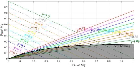 Then, solving Equations (23) and (24) for , the braking force distribution ratio can be determined for any deceleration value. Some examples are presented in Figure 6 (solid color lines).