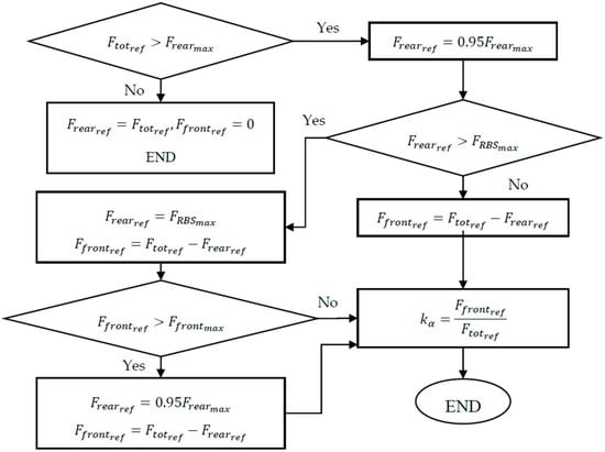 The strategy described in Figure 7 establishes the distribution coefficient and the references for the rear and front braking forces. First, the strategy considers if can be supplied by the rear wheels. Then, if the total force must be distributed, the reference for the rear wheels () is 95% of its maximal value to avoid locking the wheels (). After this, is compared to the maximal braking force that could be produced by the RBS (). If can be produced by the RBS, the strategy can decide the distribution of braking forces; if not, is , and the remaining braking force has to be provided by the front wheels (). Finally, if this is lower than , the strategy can decide the distribution of braking forces. Otherwise, if is greater or equal to , the distribution of braking forces will be defined by the maximal forces in the front and rear wheels.