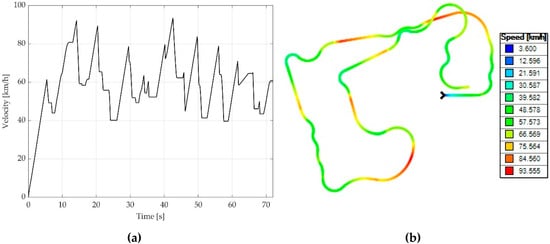 The software Optimum Lap is used to obtain the velocity profile that the car can follow in a real competition [27,28,30,37]. In this case, a car is created based on the parameters of ISEC’s car. Furthermore, the racetrack selected is a real circuit used in SAE competition 2012, which was available in the software database. The driving cycle and the racetrack map taken from Optimum Lap are presented in Figure 9.