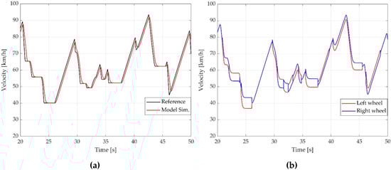 In Figure 10a, the velocity of the car’s response is presented. The car can follow the overall behavior of the driving cycle. Figure 10b shows the velocity of the rear wheels (left and right), with differences when there is a curve. A zoom in the driving cycle is done for clarity.