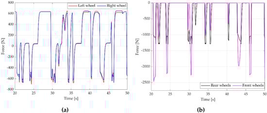 The forces applied to the rear wheels are presented in Figure 11a. The left and right forces are equal when the car is moving in a straight line. Moreover, during curves, these forces applied are different, showing the operation of the differential. Figure 11b shows the distribution of the braking forces in the front and rear wheels. The braking force in the rear wheels has a low variability in most braking events, showing that the strategy always tries to get the most of the rear braking forces. On the other hand, the variability of the forces of the front wheel is higher. The contribution of the front wheels is greater during hard braking but can be very low in light braking events.