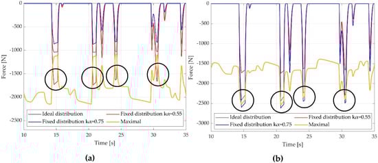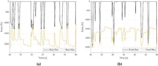 Comparison of braking forces and maximal forces (a) rear wheels; (b) front wheels.
