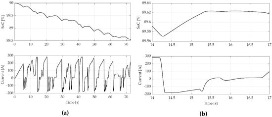 Since RBS is used, the battery of the car is charged during a braking operation. Figure 13a shows the current and SoC of the battery. The current is positive during traction and negative during braking. In the same way, the SoC decreases during traction and increases during braking. In Figure 13b, a zoom is presented to better appreciate the effect of the negative current in the SoC.