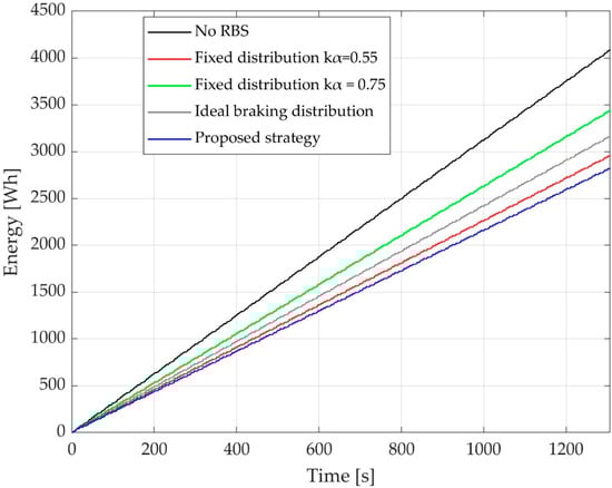 Now, energy recovery and car stability are studied to highlight the importance of the braking strategy. Figure 14 shows the energy consumed by the car studied during an endurance test of the Formula SAE, which has 22 km length. The car performance is studied without RBS as a reference to compare the energy recovery potential of the different braking strategies.