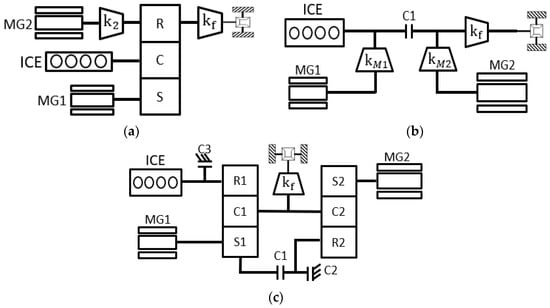 Three typical electronically controlled continuous variable transmission (eCVT) dedicated hybrid transmission (DHT) architectures: (a) Toyota hybrid synergy drive (HSD); (b) Honda intelligent multi-mode drive (iMMD); (c) GM two-mode electric variable transmission (EVT).