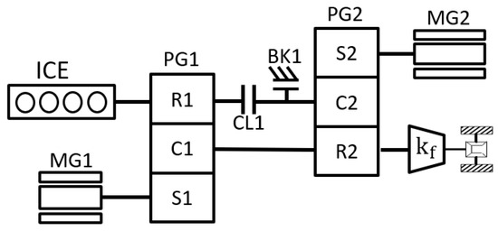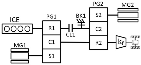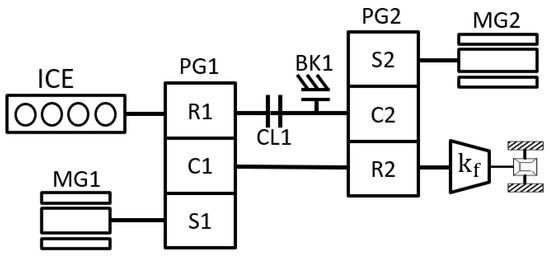 where and are defined as the gear ratios of the sun gear to ring gear of PG1 and PG2, respectively; represents the engine angular rotation speed at the PG1 ring gear R1 input shaft, as the MG1 angular speed at PG1 sun gear S1 input shaft, as the MG2 angular speed at the PG2 sun gear S2 input shaft and as the final vehicle wheel angular speed.