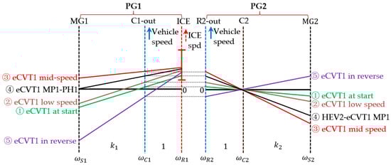 where is defined as the ICE eCVT1 gear ratio to the PG1 output, which will be continuously variable with the vehicle speed and driving load demands. At zero vehicle speed, the eCVT1 ICE gear ratio is infinite with ICE power split ratio . This implies that the ICE input power is completely converted into electricity by MG1 through the electro-mechanical path ideally. When the power split ratio , i.e., , the MG1 speed must be zero, i.e., . In this special case, the ICE input power will be completely transmitted to the vehicle wheel through the planetary mechanical path ideally. The principle of eCVT1 power split can be clarified by the planetary-gear lever diagram as illustrated in Figure 6.
