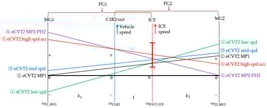 eCVT2 is a compound power-split hybrid mode [6,10,11,12,18]. Two planetary gearsets of PG1 and PG2 are restructured into a compound planetary system which allows either MG1 or MG2 to act as the speeder for splitting the ICE input power and the other as the torquer. The basic speed relationship of three power sources in this compound system can be further derived as: