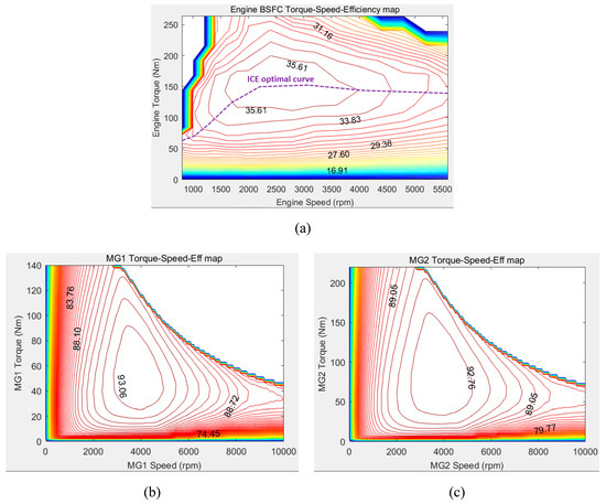 ICE, motor generator (MG)1 and MG2 torque-speed-efficiency map (a) ICE efficiency map; (b) MG1 efficiency map; (c) MG2 efficiency map.