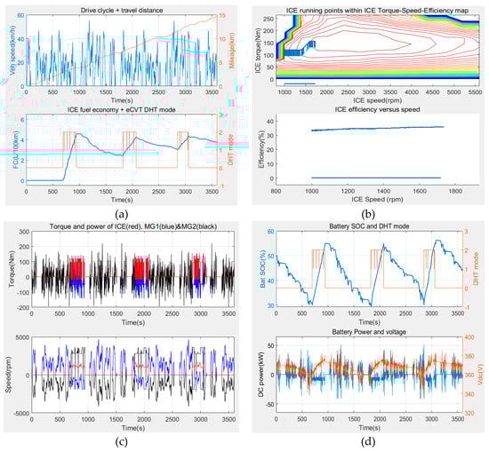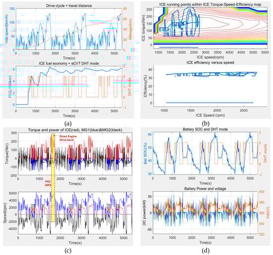 Simulation results for three Worldwide harmonized Light vehicles Test Cycle (WLTC) cycles: (a) WLTC cycle data, DHT mode and ICE fuel consumption; (b) ICE operational torque location within ICE map and efficiency; (c) ICE/MG1/MG2 operational torque and speed; (d) DHT mode, HV battery SOC, power and voltage.