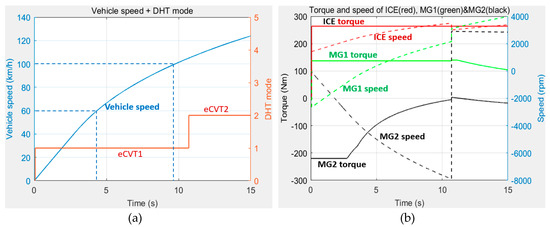 Acceleration simulation results with a full-pedal driver request: (a) vehicle speed and driving mode; (b) ICE/MG1/MG2 torque and speed.
