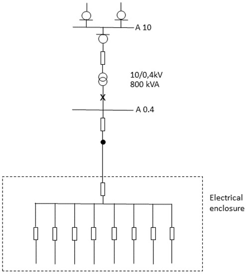 Measurements were made on four fully electric vehicles in an environment within a local distribution grid; namely, the charging facilities of a distribution-system-operator, at 1 of the 8 outbound cables in an electrical enclosure; grid configuration can be seen in Figure 3. All vehicles were charged with one-phase charging, and, during measurements, only the charger included in the measurement was connected. Measurements were done several times and checked for repeatability. This feature was included in the software and compared, so that the measured magnitudes of the first 11 harmonics were within 5% deviation.