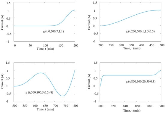 Since the harmonic curve can dramatically change shape at certain times due to an actual change to the charging circuit imposed by the control circuitry in the electric vehicle, a piecewise approximation of the harmonic currents using functions of the form g given in Equation (5) was used:
