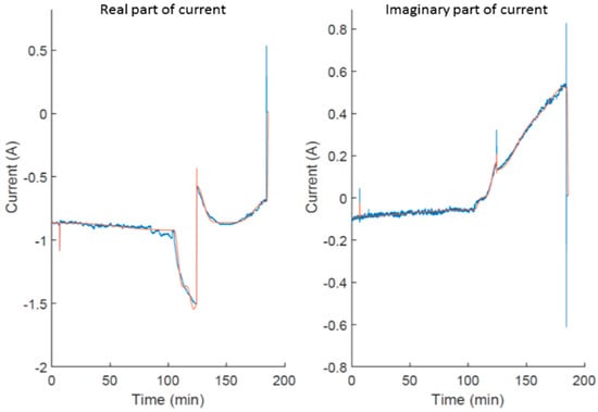 When performing the fitting, it is important to use initial parameters that at least qualitatively match the desired output; otherwise, the algorithm is likely to produce poor fitting. The result is graphically exemplified in Figure 7, where the real and imaginary part of the third current-harmonic during the charging of EV1 and the corresponding fitted function are presented in a complex plane.