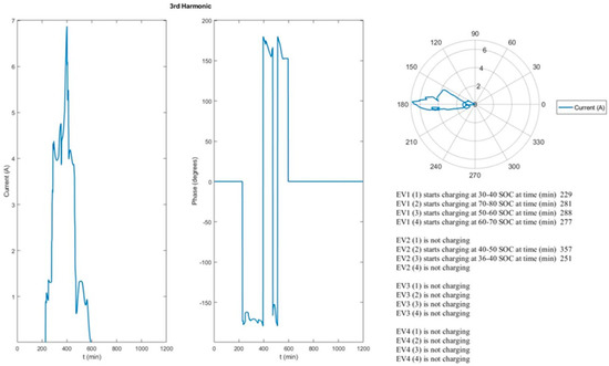Table 3 shows the resulting situation for each individual current harmonic, the maximal magnitude and time when this occurred, the EV model being charged, the SOC level at the start, the time when the EVs started charging, and in which quadrant the phase angle was found.