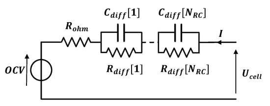 Figure 1 shows the reduced-order electro-thermal model used in our study. The electrical behavior of the cell is represented with an equivalent circuit model incorporating: (1) a voltage source to represent the open circuit voltage (OCV); (2) a resistance Rohm to represent the ohmic resistance responsible for the instantaneous voltage drop when the cell current changes; and (3) several RC circuits Rdff[i]/Cdiff[i] to represent the dynamic behavior of the cell mainly related to the diffusion of lithium-ion inside the battery cell. Different numbers of RC circuits were used in the literature, e.g., one in [7,10], two in [9] and five in [8]. Having more RC circuits helps to improve the model accuracy at the cost of complexity in parameter identification and higher calculation time [8,9]. The OCV is a function of the state of charge (SoC) and the temperature. Other elements in Figure 1 are functions of the SoC, the temperature and the current.