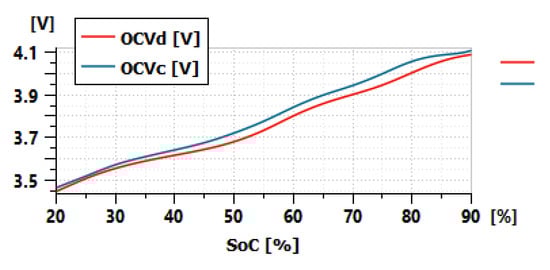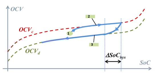 Figure 6 shows the hysteresis between the OCVd and OCVc at 25 °C. The experimental test results of a Li-ion cell in [27] show that the state of charge variation (ΔSoChys) necessary for full charge/discharge OCV transition is from 15% to 25% in most of the case. In the absence of tests to identify ΔSoChys, its value is set arbitrarily to 15% in our study. For the future studies, it would be interesting to investigate several things in the hysteresis behavior for different battery chemistries, such as the impact of the temperature on the value of ΔSoChys, as well as a fast and simple method to identify the value of ΔSoChys from limited test data.