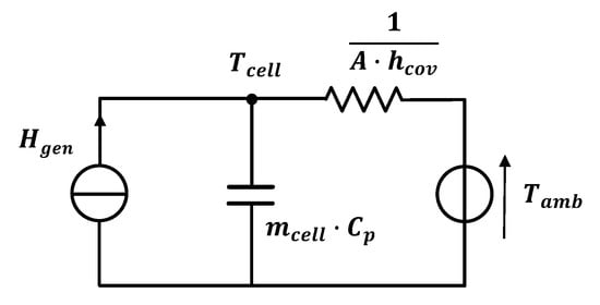 The thermal behavior of the battery cell is represented with a simple thermal model consisted of different elements as shown in Figure 3: (1) a heat source to represent the heat generated by the cell; (2) a thermal capacity of the cell; (3) a thermal convection resistance; and (4) a temperature source to represent the ambient temperature Tamb. The cell temperature Tcell is calculated with equation:
