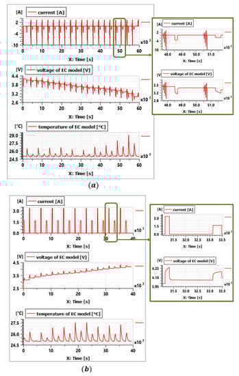These test profiles are designed on the one hand to facilitate the parameter identification with the Battery Identification Assistant tool in Simcenter Amesim [26]. On the other hand, the duration for the pulses and the current levels for the long-duration discharges or charges are chosen to minimize the temperature variation of the cell during the test. These profiles can be easily adapted to test other battery cells. In our study, the test profiles were applied to the electrochemical model at three ambient temperatures (5 °C, 25 °C and 45 °C). Figure 4 shows the examples of the simulated data from the electrochemical model at 25 °C for the two test profiles, respectively.