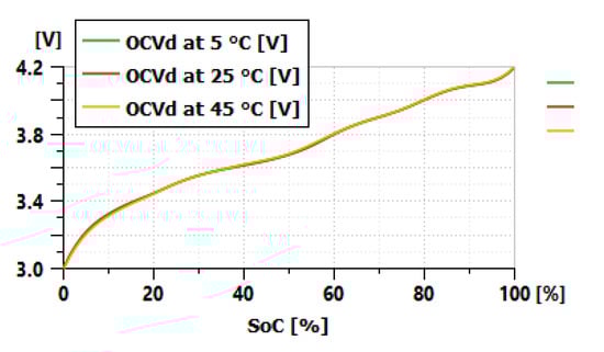 The OCVd and OCVc are identified with the relaxation phase after each long-duration discharge or charge. The value at the end of each relaxation after the long-duration discharge (Figure 4a is considered as the OCV value in discharge. Figure 5 shows an example of the OCVd identified at the three temperatures. The same process allows us to get the OCVc at the three temperatures by using the charge profile in Figure 4b. A temperature of 25 °C is chosen as the reference temperature in our study to calculate the open circuit voltage with Equation (3).