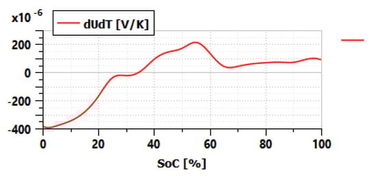 where T1 and T2 are two different temperatures; OCVx can be OCVd or OCVc. In our case, the OCV is identified at three temperatures in discharge and in charge. There are therefore six possible combinations to calculate six curves of entropic coefficient as illustrated in Table 2. The average curve of the six entropic coefficient curves is the one to be used in the reduced-order circuit model. The average curve is shown in Figure 7.