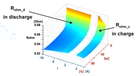 The instantaneous ohmic resistances are identified with the groups of short-duration pulses (Figure 4a). These pulses allow to get the ohmic resistance value at different SoCs, currents and temperatures. Figure 8 shows the result of the ohmic resistance identified at 25 °C.