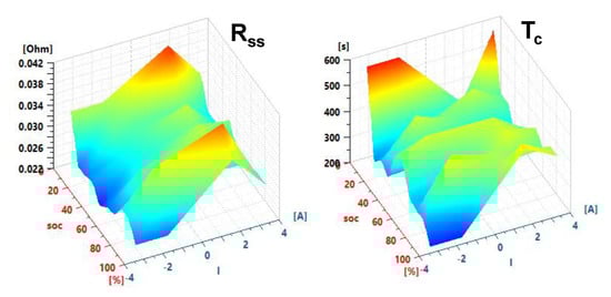 By using the long-duration discharge and charge pulses in Figure 4 which decrease or increase 5% SoC of the cell, the RC circuits Rdff[i]/Cdiff[i] are identified with the Battery Identification Assistant tool of Simcenter Amesim. Instead of identifying directly several RC circuits, the tool identifies a Warburg impedance represented by two parameters (a diffusion resistance Rss and a time coefficient Tc). The identification process of the Warburg impedance is similar to the ones in [15,16]. Once the Warburg impedance is identified, it can be easily approximated by a different number of RC circuits in the Simcenter Amesim battery model with the help of the RC transformation tool [26]. The parameters Rss and Tc of the Warburg impedance are identified at three different temperatures (5, 25 and 45 °C). Their values are in function of the current, the SoC and the temperature. Figure 9 shows the Rss and Tc identified at 25 °C.