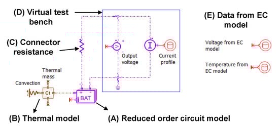 Figure 10 shows the simulation sketch in Simcenter Amesim to evaluate the performance of the reduced-order circuit model. The sketch includes several elements, such as (A) the battery model which represents the electrical model in Figure 1; (B) a convective heat exchange component and a thermal mass to represent the thermal model in Figure 3; (C) a resistance to represent the connector resistance in the electrochemical model; (D) a virtual test bench to deliver current to the battery model and measure the voltage; (E) three tables which import the current, voltage and temperature data generated by the electrochemical model (EC model). This sketch allows us to compare the estimation of the two models on the battery voltage and temperature for the same current profile.
