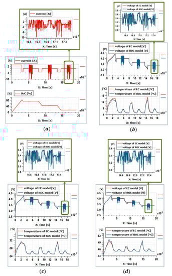 where VECM,k is the voltage or temperature of the electrochemical model; VROM,k is the voltage or temperature of the reduced-order circuit model; Ns is the number of the voltage or temperature data sample. Table 4 and Table 5 present the RMS errors of the voltage and temperature estimation according to the number of RC circuits used. The results show that the reduced-order circuit model with one RC circuit is sufficient to correctly simulate the electrochemical model. Adding additional RC circuits does not significantly improve the estimation precision. The RMS errors of the reduced-order circuit model are similar to the ones reported in other works in the literature [7,9].