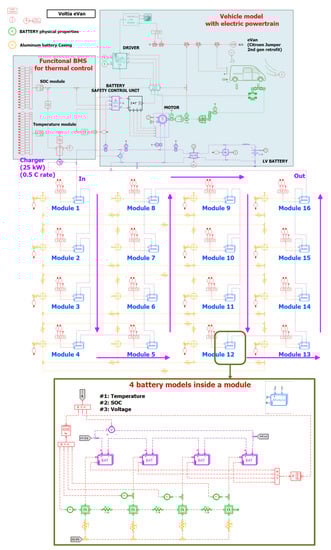 By using the reduced-order cell model descripted in Section 3, a battery pack model has been built in Simcenter Amesim. Figure 12 shows the simulation sketch of the electric vehicle including the battery pack model. The battery pack model includes 16 modules in series as the real pack. However, not every single cell is represented in each module of the battery pack model. To limit the number of components in the sketch, each module includes only four battery models in series. Each battery model is used to represent three groups of cells, which means 60 cells (20P3S) in total. All these 60 cells are considered to be identical, so only one battery model is enough to represent all of them by configuring the architecture of the battery model in Simcenter Amesim to be 20 in parallel and three in series (20P3S). By doing so, the battery pack is split into 48 battery models, which allows one to have access to, for example, 48 temperatures at different places in the battery pack. The battery pack casing is also modeled. The casing is divided into 16 parts and each part is represented by a thermal mass element. The thermal mass of each part of the casing is connected to the nearby module.