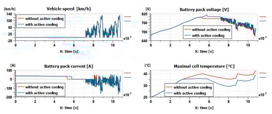 To illustrate the use of the battery pack model with a BMS, a case study is presented in Figure 13 to compare the electro-thermal behavior of the battery pack under two cooling scenarios: with and without the active air cooling. For the scenario with the active air cooling, the functional BMS is used to turn on the air cooling when one of the 48 battery models reaches 35 °C. In this case, the heat exchange of the casing with its environment will change from natural convection (with hconv equal to 20 W/m2/K) to forced convection (with hconv equal to 200 W/m2/K). The active air cooling is turned off when all the 48 temperatures are less than 30 °C. For both scenarios, the battery pack is charged during the first 2 h. Then the vehicle follows two WLTC (Worldwide harmonized Light-duty vehicles Test Cycles) driving cycles. The comparison of the simulation results for the two scenarios shows that the active cooling helps to increase the effective charge time and significantly decrease the battery cell temperatures.