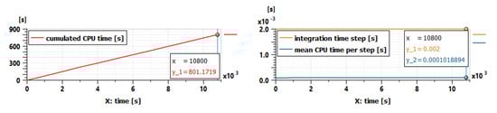 To use the battery pack model for the SiL and HiL tests, the simulation time of the battery pack model must be analyzed to confirm its real-time capability. Indeed, model in the SiL platform and especially in the HiL platform must be run with fixed step solver and must be faster than real time at each integration step. Figure 14 shows an analysis of the simulation time for the scenario with the active air cooling. The simulation sketch in Figure 12 was run with a fixed step solver by setting the integration time step to 0.002 s. The simulation was carried out on a laptop with Intel i7 2.6 GHz CPU, 16 GB RAM and a 512 GB SSD hard drive. The Euler method is used for the fixed step solver in the Simcenter Amesim. In Figure 14, the cumulative CPU time for the simulation is 801 s at the end of the simulation, which is 13 times faster than the duration of the scenario (10,800 s). The mean CPU time used per step (0.0001 s) is 20 times faster than the fixed time step value (0.002 s). The real-time capability of the model in Figure 12 is then validated.